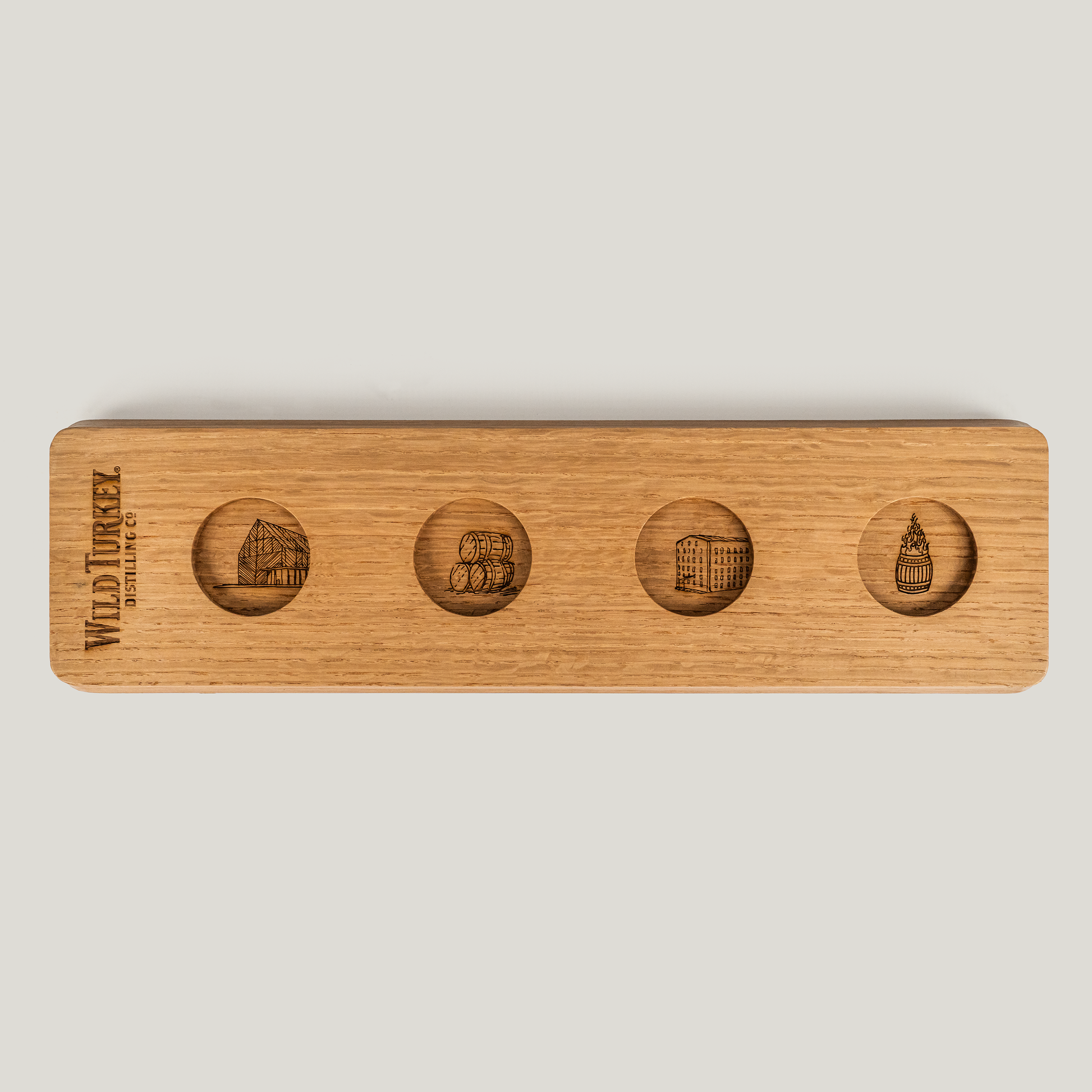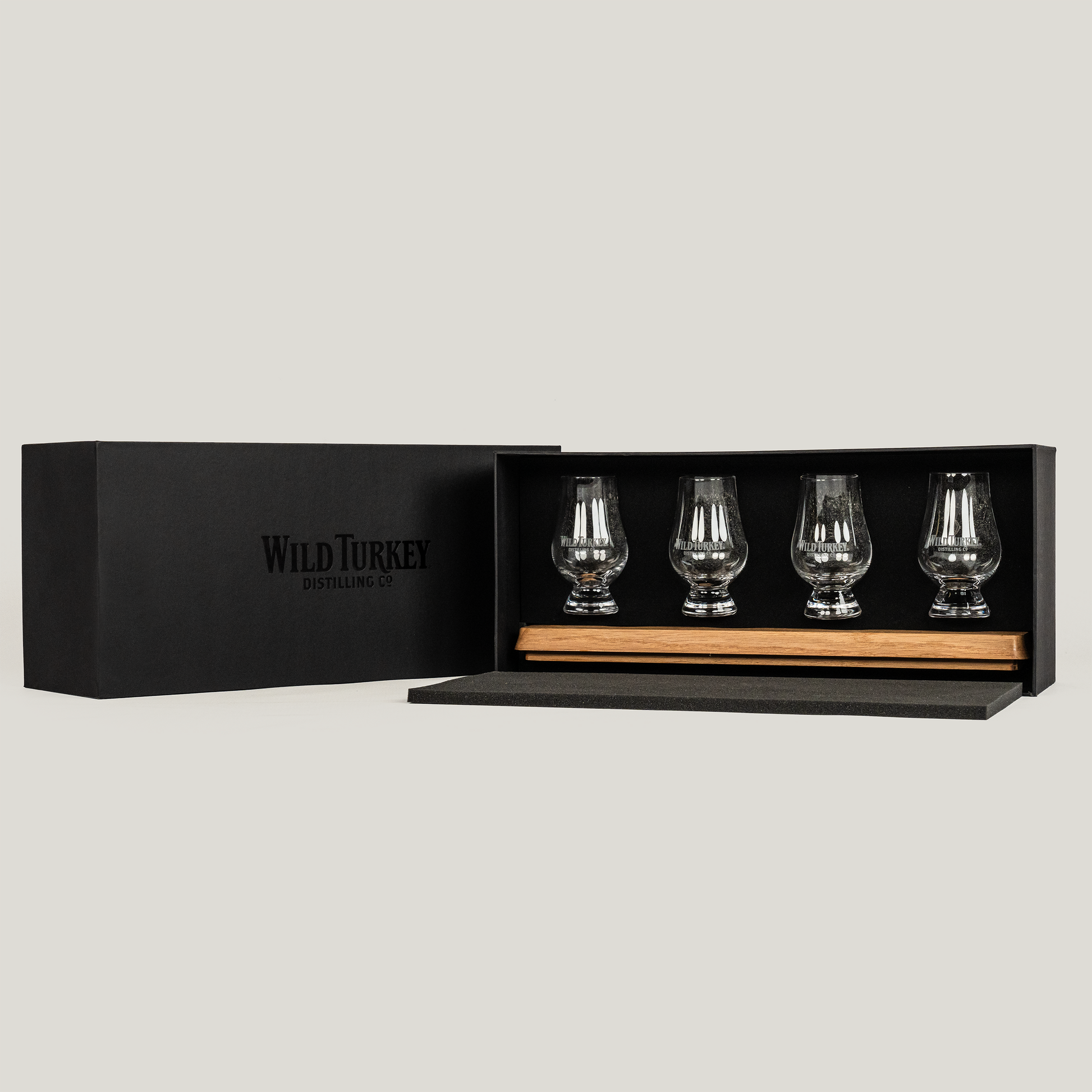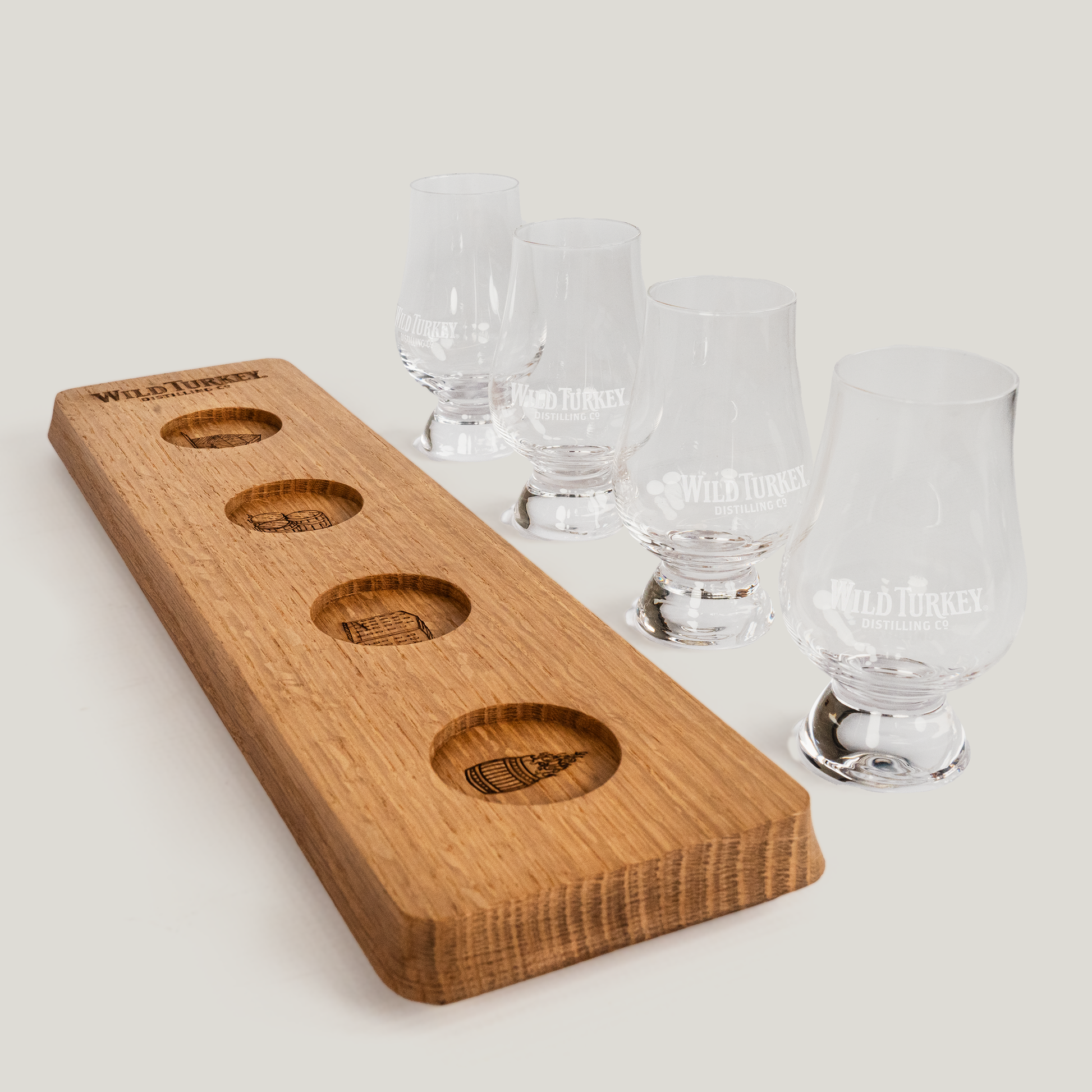 Set of four lead-free crystal Glencairn style tasting glasses, each elegantly laser-etched with the "Wild Turkey Distilling Co." logo. This set comes with a solid American white oak tasting flight, featuring laser-etched Wild Turkey icon artwork. Ideal for sharing and comparing your favorite drops side by side. Supplied in 2 piece gift box.