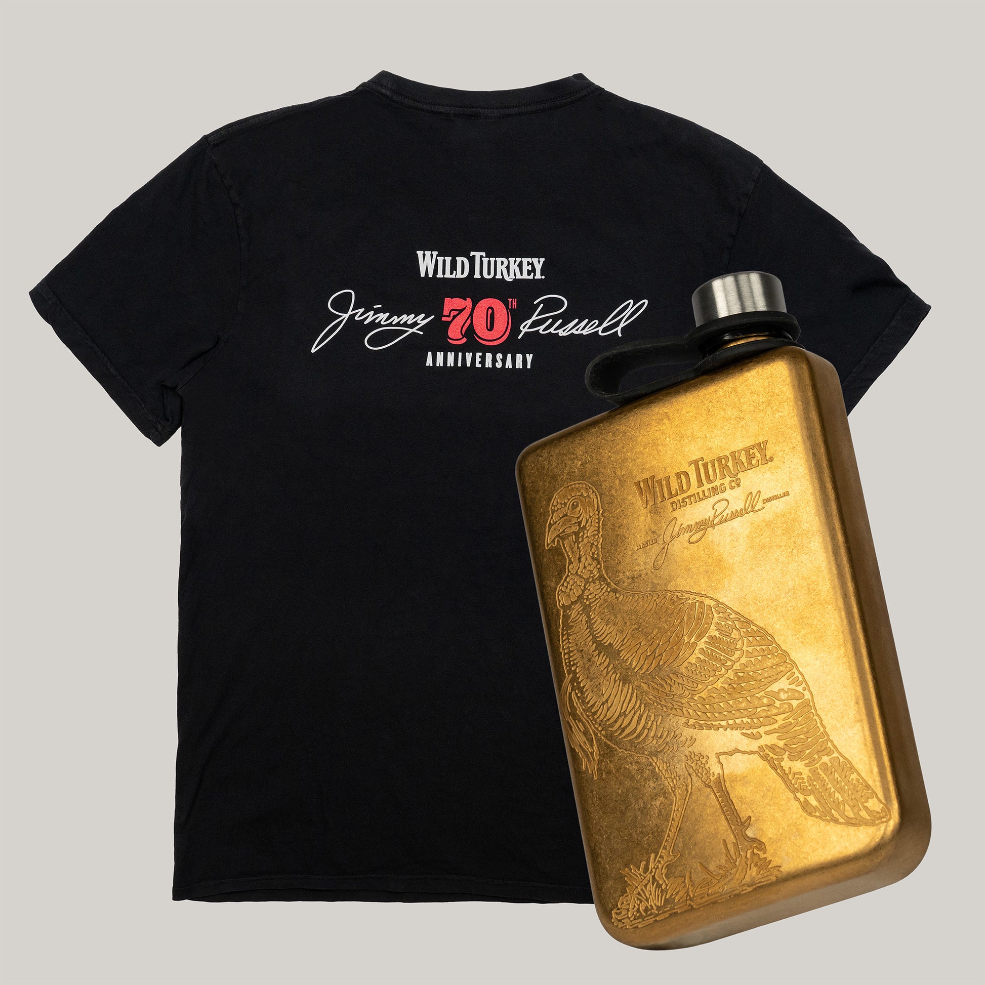 Celebrate Jimmy Russell’s 70th anniversary with this exclusive Wild Turkey bundle. It features a black limited-edition anniversary T-shirt and a gold stainless steel hip flask, both honoring his legendary legacy. A perfect collectible for whiskey enthusiasts.